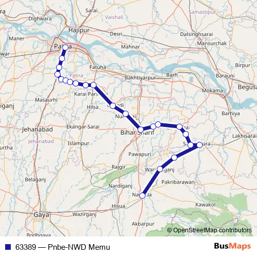 The first stop of the 63389 rail route is Patna Jn and the last stop is Nawadah. 63389 (Pnbe-NWD Memu) is operational during everyday.