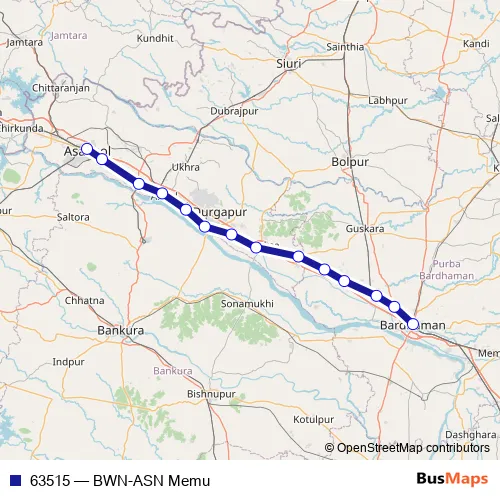 The first stop of the 63515 rail route is Bardhaman and the last stop is Asansol Jn.. 63515 (BWN-ASN Memu) is operational during everyday.