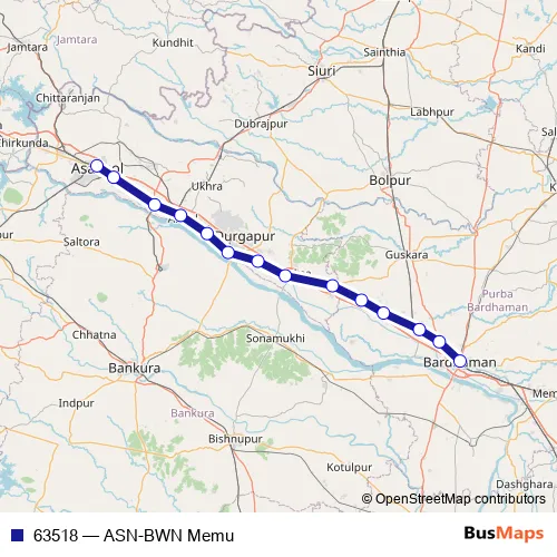The first stop of the 63518 rail route is Asansol Jn. and the last stop is Bardhaman. 63518 (ASN-BWN Memu) is operational during everyday.