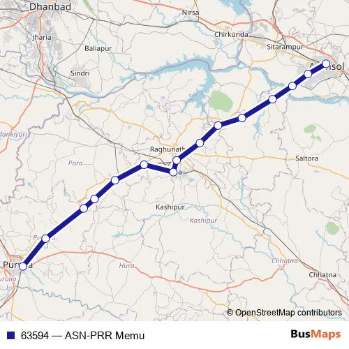 The first stop of the 63594 rail route is Asansol Jn. and the last stop is Purulia Jn.. 63594 (ASN-PRR Memu) is operational during everyday.