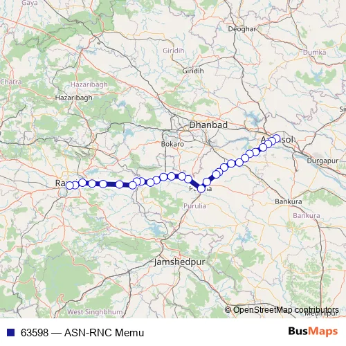 The first stop of the 63598 rail route is Asansol Jn. and the last stop is Ranchi. 63598 (ASN-RNC Memu) is operational during everyday.