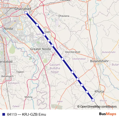 The first stop of the 64113 rail route is Khurja Jn and the last stop is Ghaziabad. 64113 (KRJ-GZB Emu) is operational during everyday.