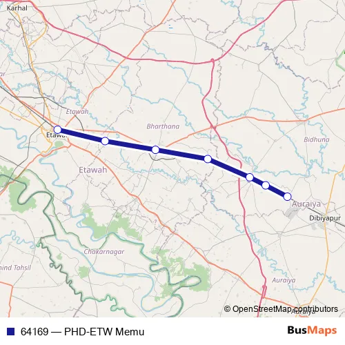 The first stop of the 64169 rail route is Phaphund and the last stop is Etawah Jn. 64169 (PHD-ETW Memu) is operational during everyday.