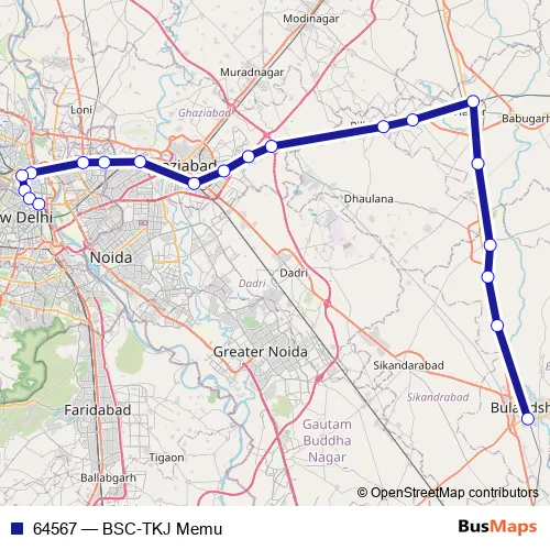 The first stop of the 64567 rail route is Bulandshahr and the last stop is Tilak Bridge. 64567 (BSC-TKJ Memu) is operational during everyday.