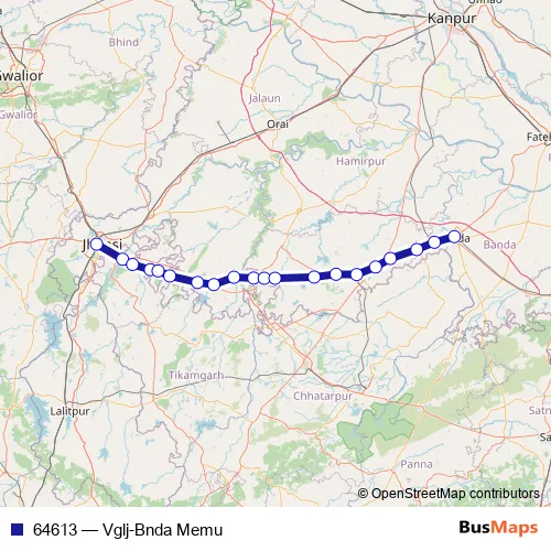 The first stop of the 64613 rail route is Virangana Lakshmibai Jhansi Jn and the last stop is Banda Jn. 64613 (Vglj-Bnda Memu) is operational during everyday.