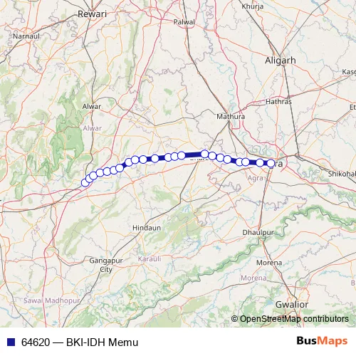 The first stop of the 64620 rail route is Bandikui Jn and the last stop is Idgah Jn. 64620 (BKI-IDH Memu) is operational during everyday.