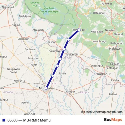 The first stop of the 65303 rail route is Moradabad and the last stop is Ramnagar. 65303 (MB-RMR Memu) is operational during everyday.