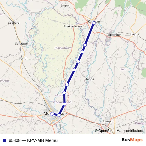The first stop of the 65308 rail route is Kashipur and the last stop is Moradabad. 65308 (KPV-MB Memu) is operational during everyday.