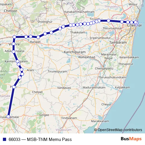 The first stop of the 66033 rail route is Chennai Beach and the last stop is Tiruvannamalai. 66033 (MSB-TNM Memu Pass) is operational during everyday.