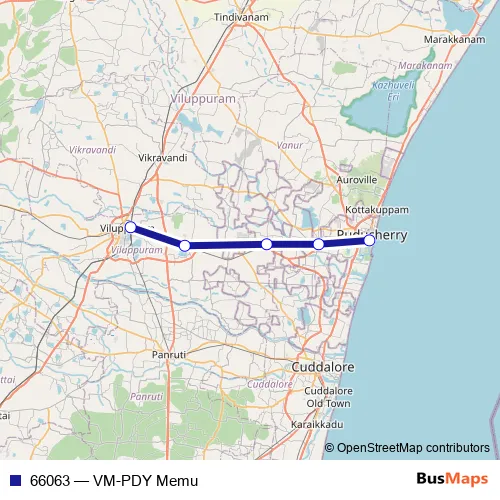 The first stop of the 66063 rail route is Villupuram Jn and the last stop is Pondicherry. 66063 (VM-PDY Memu) is operational during everyday.