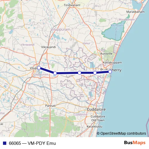The first stop of the 66065 rail route is Villupuram Jn and the last stop is Pondicherry. 66065 (VM-PDY Emu) is operational during everyday.