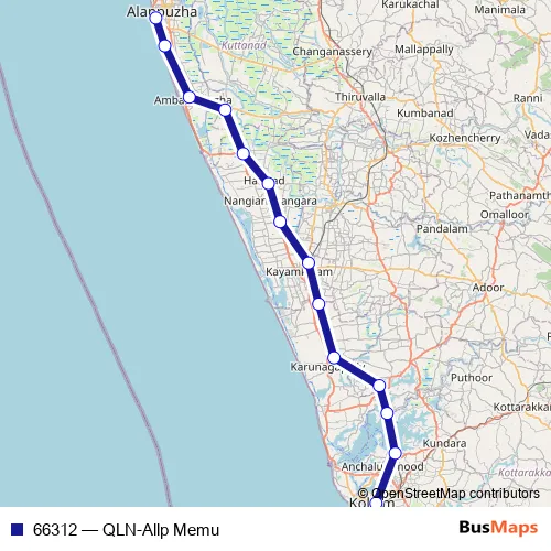 The first stop of the 66312 rail route is Kollam Jn and the last stop is Alappuzha. 66312 (QLN-Allp Memu) is operational during everyday.