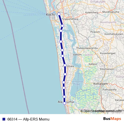 The first stop of the 66314 rail route is Alappuzha and the last stop is Ernakulam Jn. 66314 (Allp-ERS Memu) is operational during everyday.