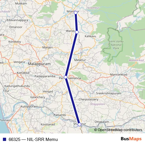 The first stop of the 66325 rail route is Nilambur Road and the last stop is Shoranur Jn. 66325 (NIL-SRR Memu) is operational during everyday.