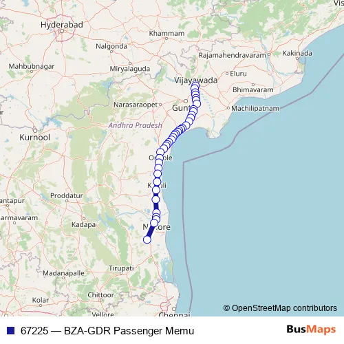 The first stop of the 67225 rail route is Vijayawada Jn and the last stop is Gudur Jn. 67225 (BZA-GDR Passenger Memu) is operational during everyday.