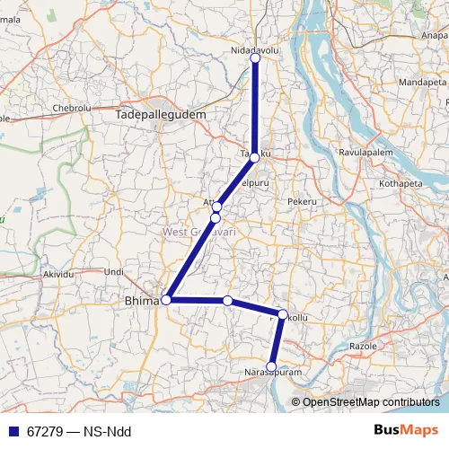 The first stop of the 67279 rail route is Narasapur and the last stop is Nidadavolu Jn. 67279 (NS-Ndd) is operational during everyday.