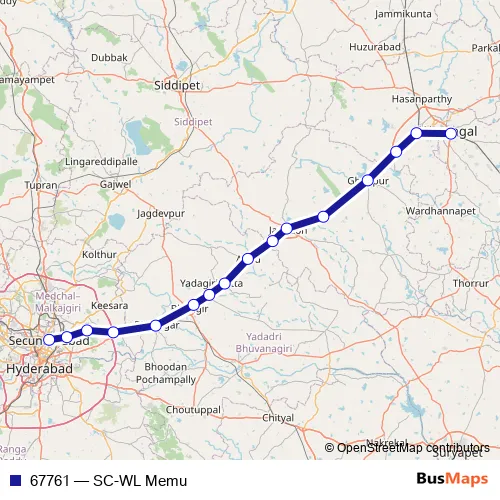 The first stop of the 67761 rail route is Secunderabad Jn and the last stop is Warangal. 67761 (SC-WL Memu) is operational during everyday.