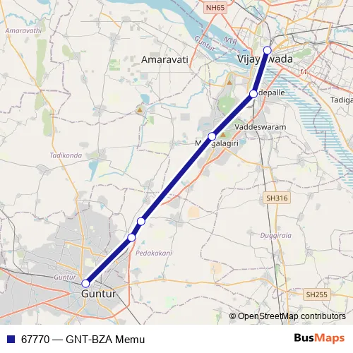 The first stop of the 67770 rail route is Guntur Jn and the last stop is Vijayawada Jn. 67770 (GNT-BZA Memu) is operational during everyday.