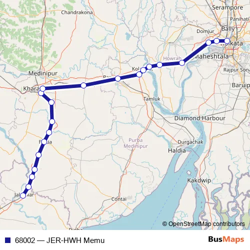 The first stop of the 68002 rail route is Jaleswar and the last stop is Howrah Jn. 68002 (JER-HWH Memu) is operational during everyday.