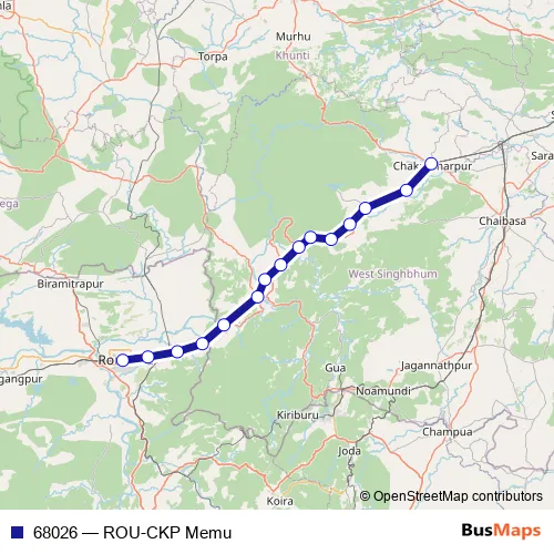 The first stop of the 68026 rail route is Rourkela and the last stop is Chakaradharpur. 68026 (ROU-CKP Memu) is operational during everyday.
