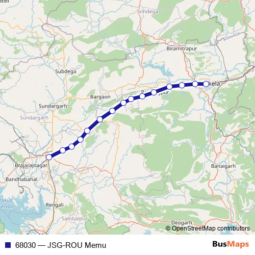 The first stop of the 68030 rail route is Jharsuguda Jn and the last stop is Rourkela. 68030 (JSG-ROU Memu) is operational during everyday.