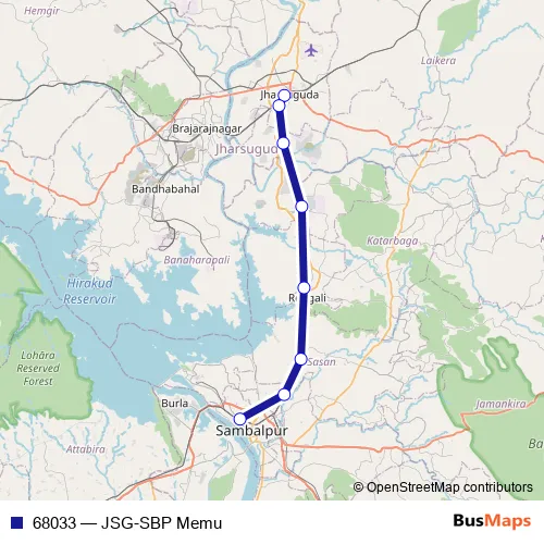 The first stop of the 68033 rail route is Jharsuguda Jn and the last stop is Sambalpur Jn.. 68033 (JSG-SBP Memu) is operational during everyday.