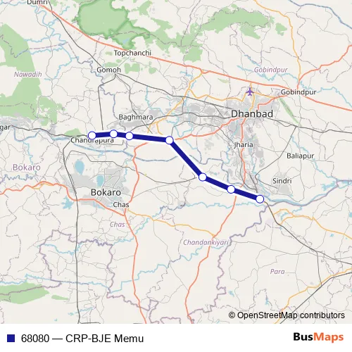 The first stop of the 68080 rail route is Chandrapura and the last stop is Bhojudih Jn.. 68080 (CRP-BJE Memu) is operational during everyday.