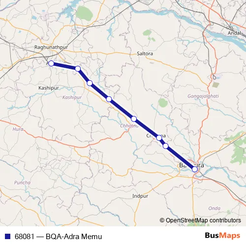 The first stop of the 68081 rail route is Bankura and the last stop is Adra. 68081 (BQA-Adra Memu) is operational during everyday.