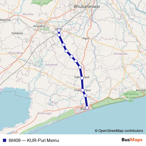 The first stop of the 68409 rail route is Khurda Road Jn and the last stop is Puri. 68409 (KUR-Puri Memu) is operational during everyday.