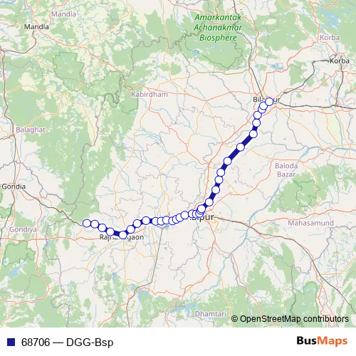 The first stop of the 68706 rail route is Dongargarh and the last stop is Bilaspur Jn.. 68706 (DGG-Bsp) is operational during everyday.
