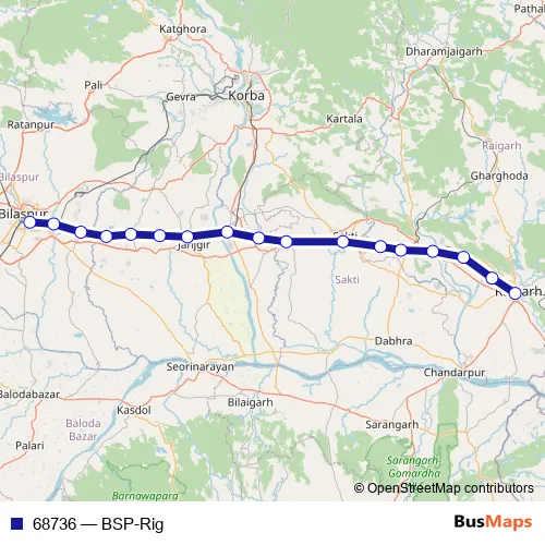 The first stop of the 68736 rail route is Bilaspur Jn. and the last stop is Raigarh. 68736 (BSP-Rig) is operational during everyday.