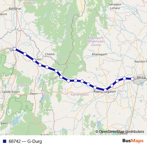 The first stop of the 68742 rail route is Gondia Jn and the last stop is Durg. 68742 (G-Durg) is operational during everyday.