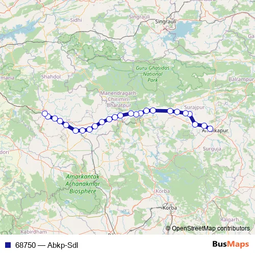 The first stop of the 68750 rail route is Ambikapur and the last stop is Shahdol. 68750 (Abkp-Sdl) is operational during everyday.