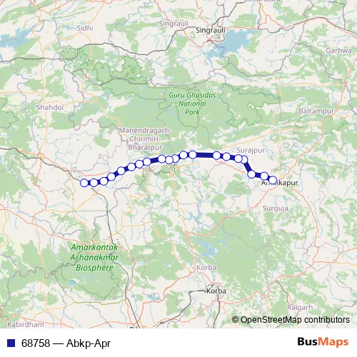 The first stop of the 68758 rail route is Ambikapur and the last stop is Anuppur Jn. 68758 (Abkp-Apr) is operational during everyday.