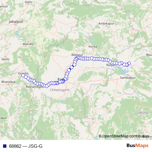 The first stop of the 68862 rail route is Jharsuguda Jn and the last stop is Gondia Jn. 68862 (JSG-G) is operational during everyday.