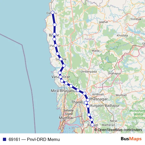 The first stop of the 69161 rail route is Panvel and the last stop is Dahanu Road. 69161 (Pnvl-DRD Memu) is operational during everyday.