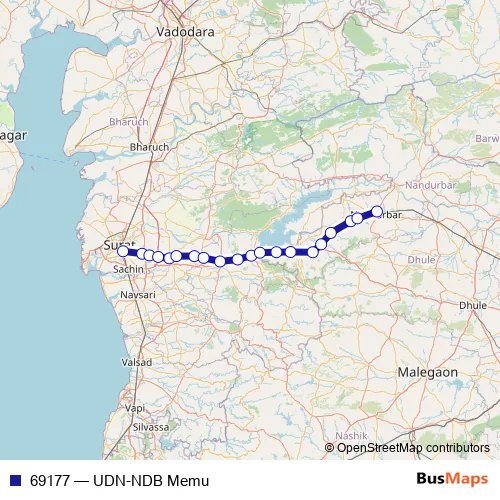 The first stop of the 69177 rail route is Udhna Jn and the last stop is Nandurbar. 69177 (UDN-NDB Memu) is operational during everyday.