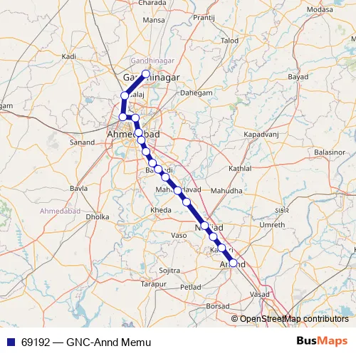 The first stop of the 69192 rail route is Gandhinagar Capital and the last stop is Anand Jn. 69192 (GNC-Annd Memu) is operational during everyday.