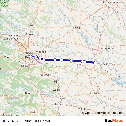 The first stop of the 71413 rail route is Pune Jn and the last stop is Daund Jn. 71413 (Pune-DD Demu) is operational during everyday.