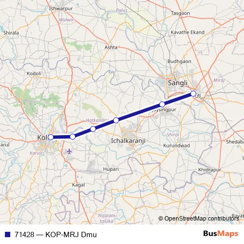 The first stop of the 71428 rail route is Kolhapur and the last stop is Miraj Jn.. 71428 (KOP-MRJ Dmu) is operational during everyday.