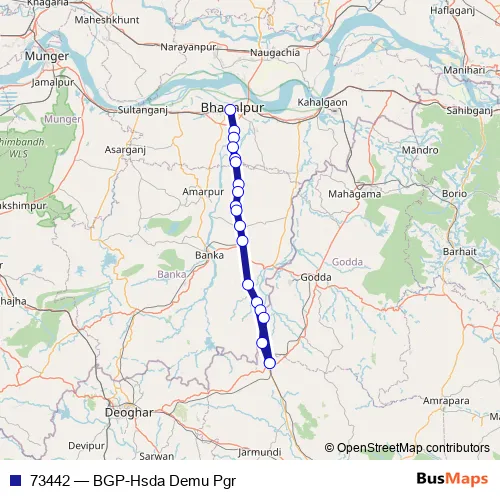 The first stop of the 73442 rail route is Bhagalpur and the last stop is Hansdiha. 73442 (BGP-Hsda Demu Pgr) is operational during everyday.