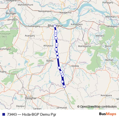 The first stop of the 73443 rail route is Hansdiha and the last stop is Bhagalpur. 73443 (Hsda-BGP Demu Pgr) is operational during everyday.