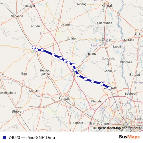 The first stop of the 74020 rail route is Jind Jn and the last stop is Sonipat. 74020 (Jind-SNP Dmu) is operational during everyday.