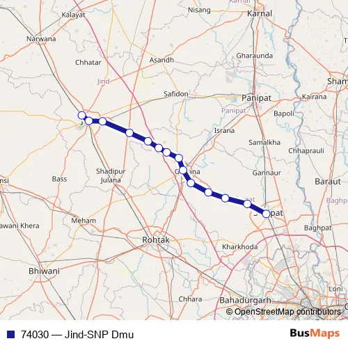 The first stop of the 74030 rail route is Jind Jn and the last stop is Sonipat. 74030 (Jind-SNP Dmu) is operational during everyday.