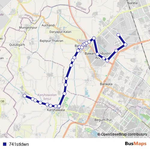 The first stop of the 741stldwn bus route is Jonti Village and the last stop is Bawana Sec 5 Cluster Depot. 741stldwn is operational during everyday.