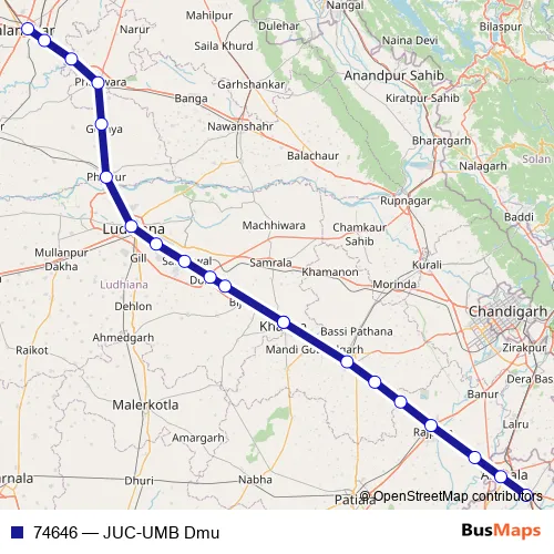 The first stop of the 74646 rail route is Jalandhar City and the last stop is Ambala Cant Jn. 74646 (JUC-UMB Dmu) is operational during everyday.