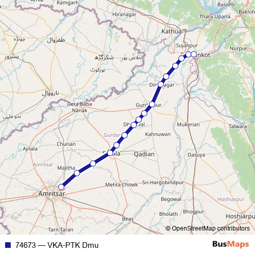 The first stop of the 74673 rail route is Verka Jn and the last stop is Pathankot. 74673 (VKA-PTK Dmu) is operational during everyday.
