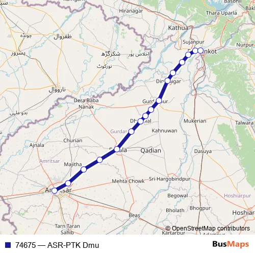 The first stop of the 74675 rail route is Amritsar and the last stop is Pathankot. 74675 (ASR-PTK Dmu) is operational during everyday.