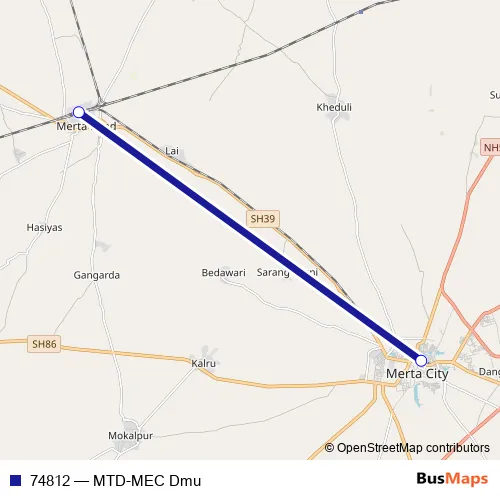 The first stop of the 74812 rail route is Merta Road Jn and the last stop is Merta City. 74812 (MTD-MEC Dmu) is operational during everyday.