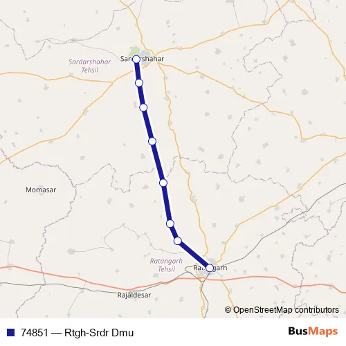 The first stop of the 74851 rail route is Ratangarh Jn and the last stop is Sardarshahr. 74851 (Rtgh-Srdr Dmu) is operational during everyday.